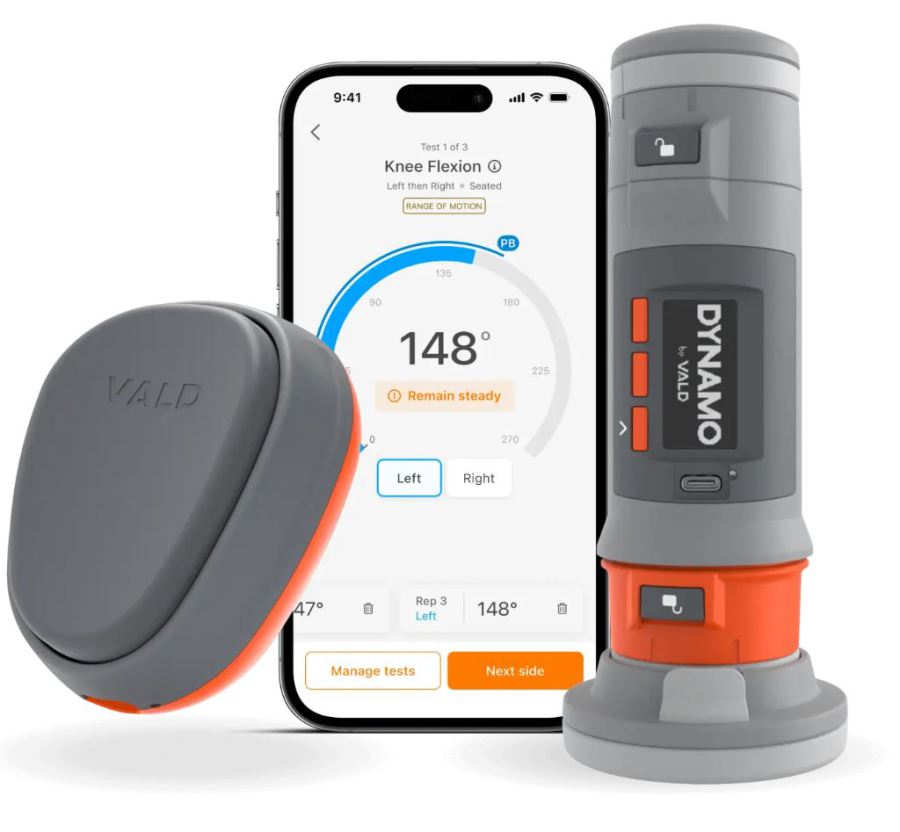 El DYNAMO de VALD es un dinamómetro portátil de mano que te permite medir la fuerza de grupos musculares específicos con una precisión digital milimétrica.